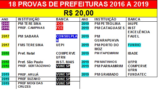 18 provas de Prefeituras Municipais de 2016 a 2019 por 20,00 Reais Published on 21 de setembro de 2019 in Estude para serviço social com 75 provas por 60 reaisResolução original (523 × 310) ← Anterior Próxima →
